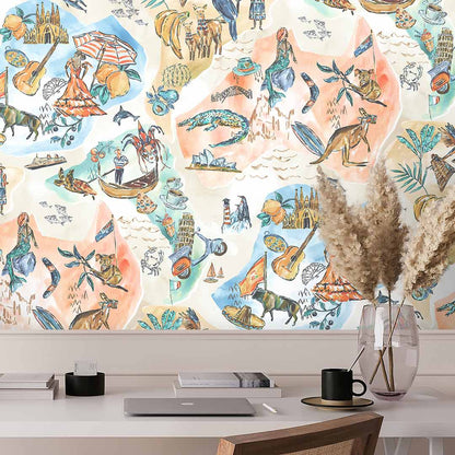 Travel Map wallpaper by Brand McKenzie lets you Elevate your wanderlust with a captivating map showcasing your favourite destinations in a handpainted style design, offering inspiration to plan your next adventure to the vibrant locales of Spain, the charm of Italy, and the beauty of Australia.