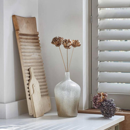 Its curved silhouette and frosted finish exude modern elegance and ethereal beauty, creating a mesmerizing play of light and shadows. Crafted with longevity in mind, this glass vase boasts a premium glaze that ensures its beauty will last for years to come. And its waterproof design provides a solid barrier against spills, protecting your valuable surfaces.