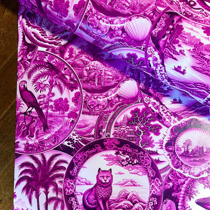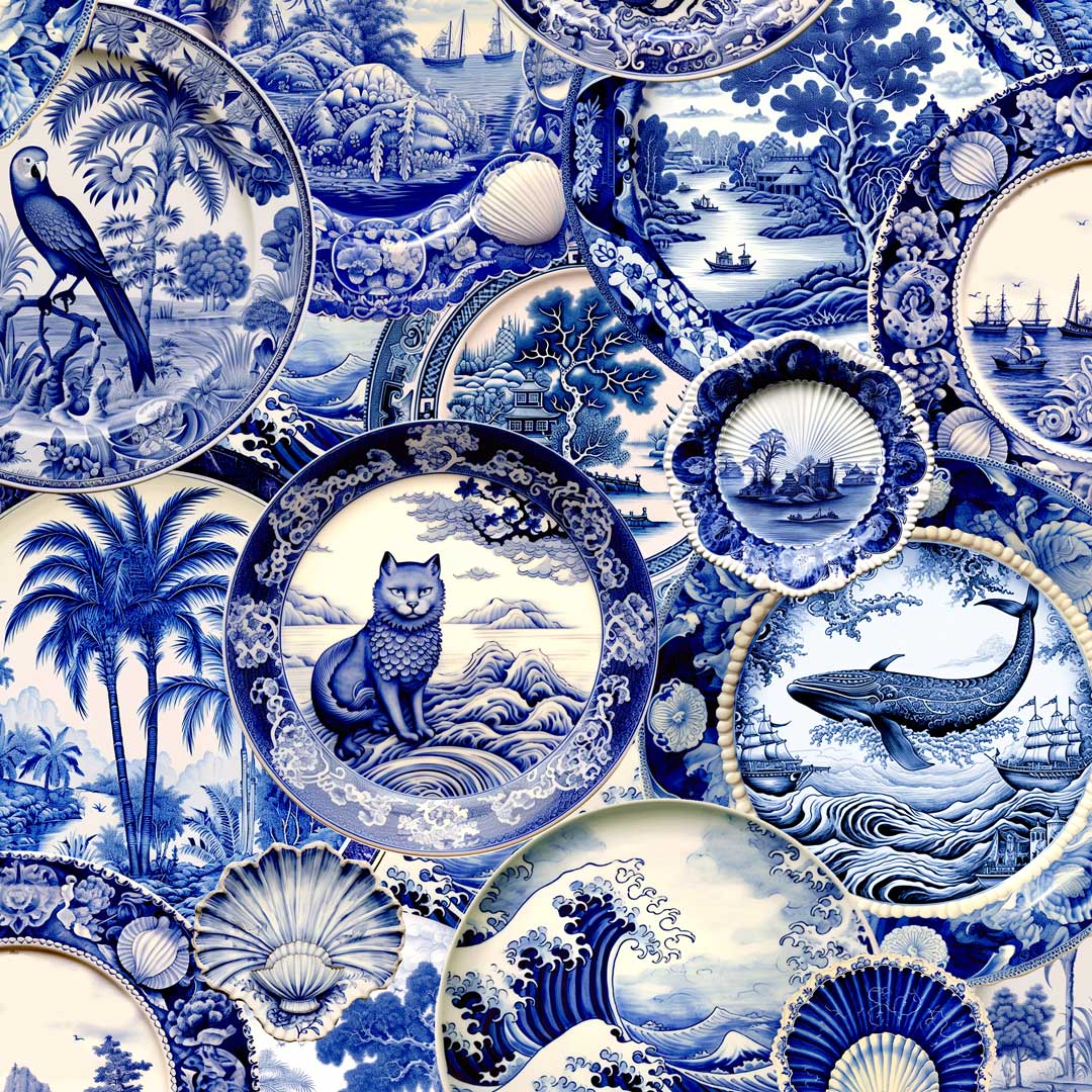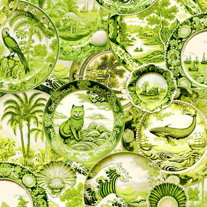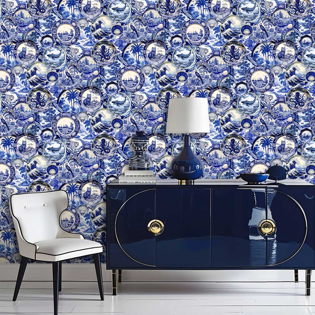 Transform your living space with this striking Whimsical Willow Plates Wallpaper! This maximalist wallpaper radiates a bold style, featuring a stunning collection of ornate ceramic plates in your choice of four captivating colours. Each plate is beautifully decorated with mythical creatures, from graceful cats and majestic tigers to elegant birds and elusive octopuses.
