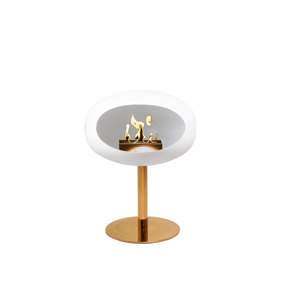 The modern white ground steel bioethanol fireplace by Le Feu can be placed anywhere in your home or garden. This sleek portable bioethanol fire features a white iron dome with rose gold coloured steel leg and base and is designed to burn eco friendly bioethanol fuel.