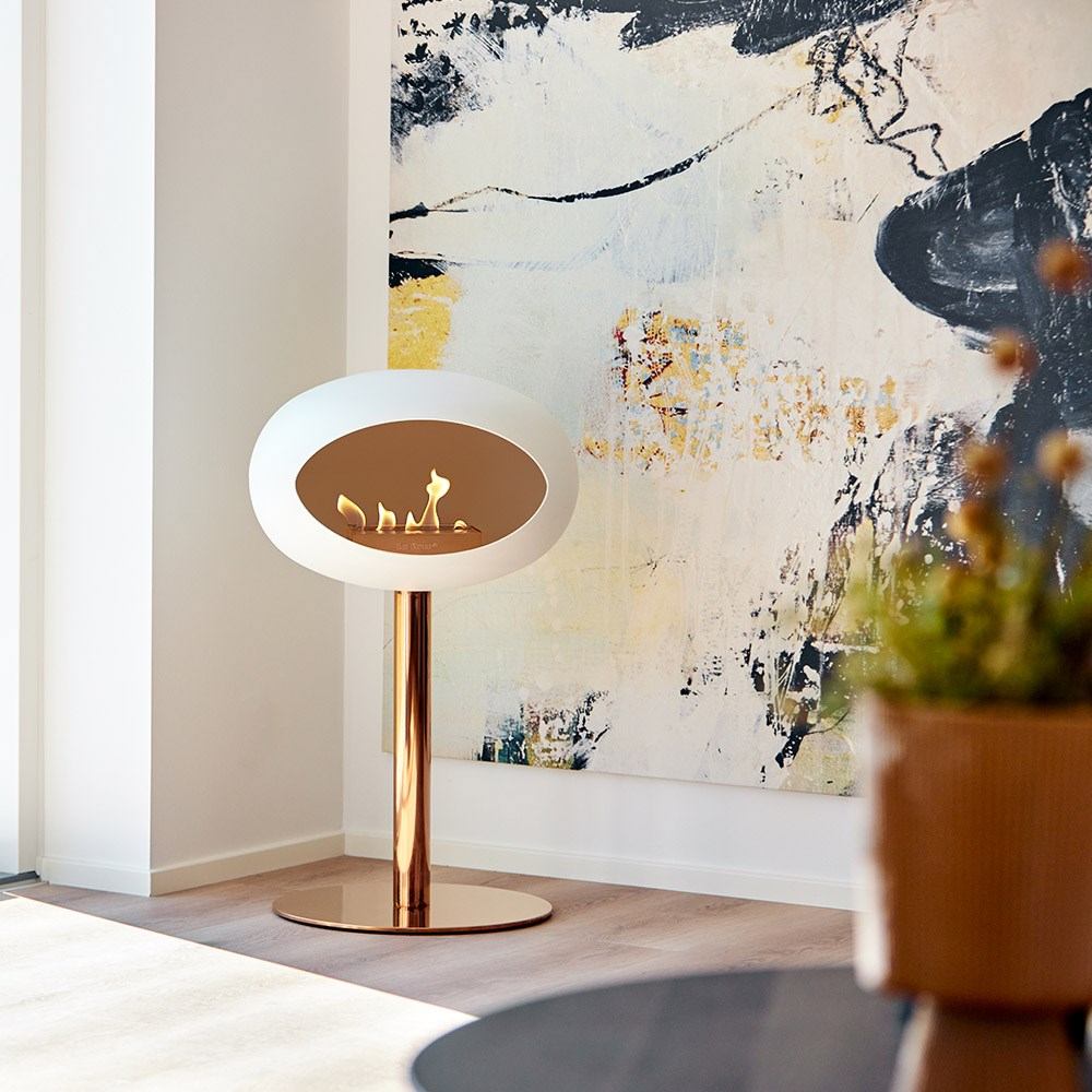 The Scandinavian inspired Le Feu Ground Steel bio-ethanol fireplace in white finish has a 50cm Rose Gold stand and matching base creating a beautiful form and design.