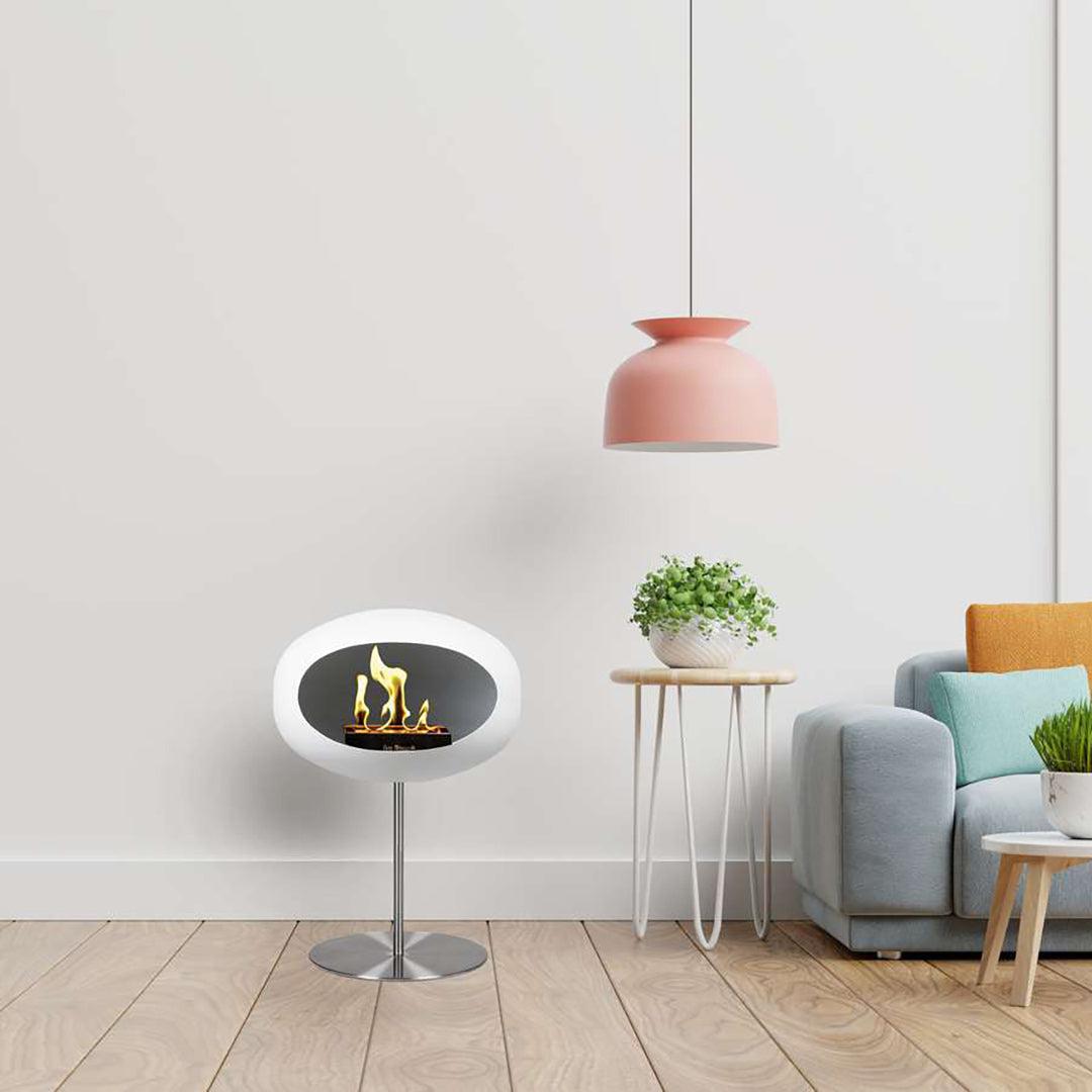 The contemporary white ground steel bioethanol fireplace by Le Feu can be placed anywhere in your home or garden. This sleek portable bioethanol fireplace features a black iron dome with steel leg and base and is designed to burn eco friendly bioethanol fuel.
