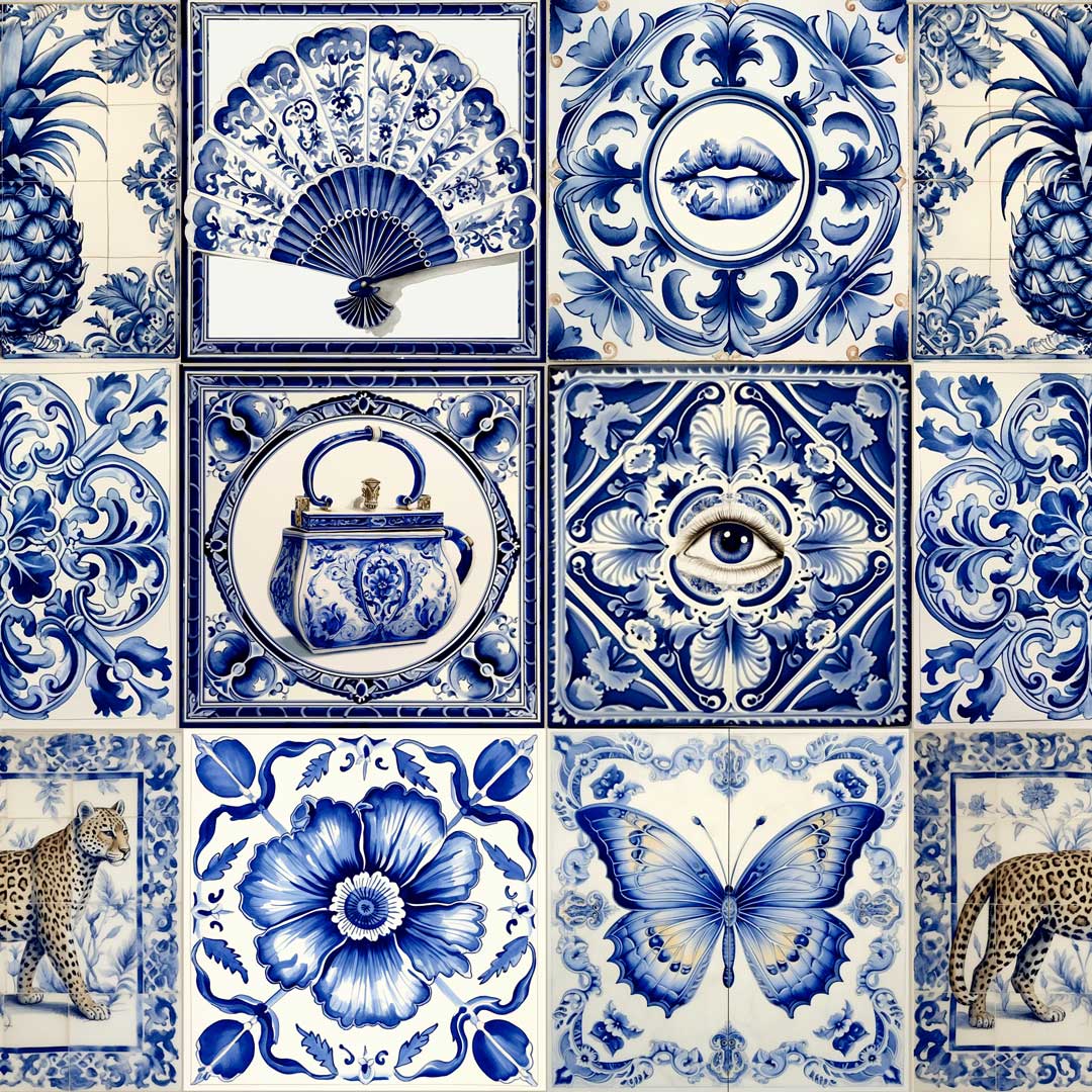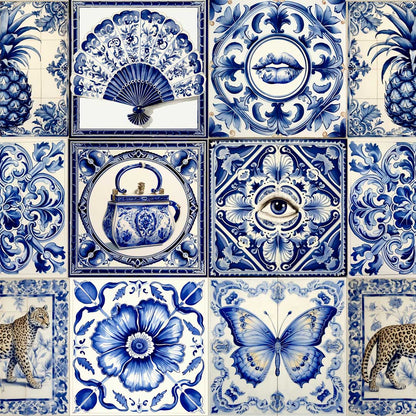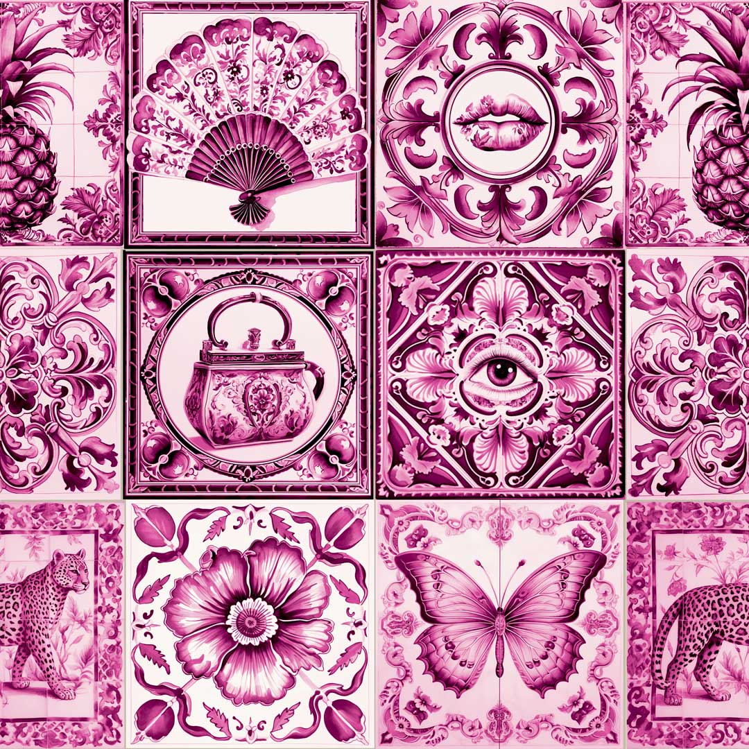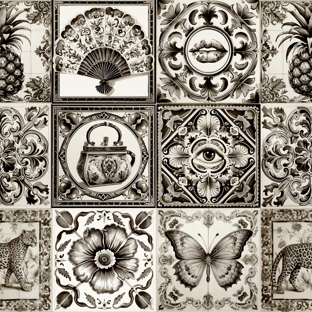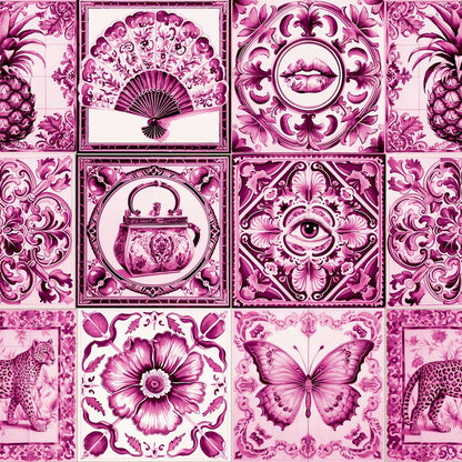 At first glance, this wallpaper may seem like a traditional Italian tile, but upon closer inspection, you'll discover a whole new level of sophistication. Designer handbags, vibrant lipsticks, chic sunglasses, and even swaying palm trees emerge from the intricate tile pattern, creating a visual masterpiece that is both eye-catching and unique.