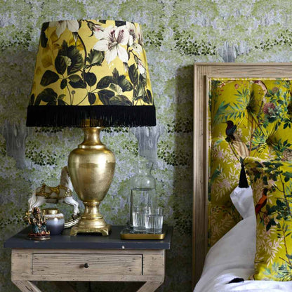 The lampshade features an opulent floral design with large scale blooming flowers and beautifully illustrated foliage in a very feminine style composition.