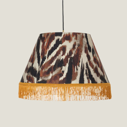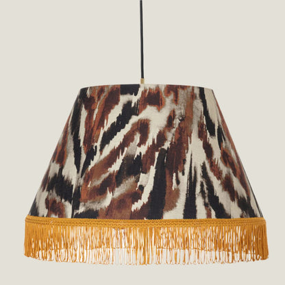 Featuring a unique and intricate pattern reminiscent of a zebra's stripes, the Zebrato Marrone Pendant Light is a statement piece that will elevate any space. The golden looped fringes add a touch of opulence and perfectly complement the bold print, creating a luxury light for your home.